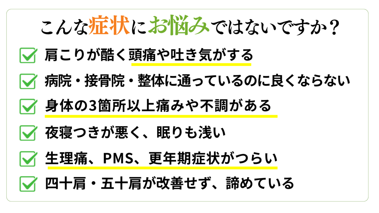 毎日悩まされるツライ症状、痛み、悩み、、、