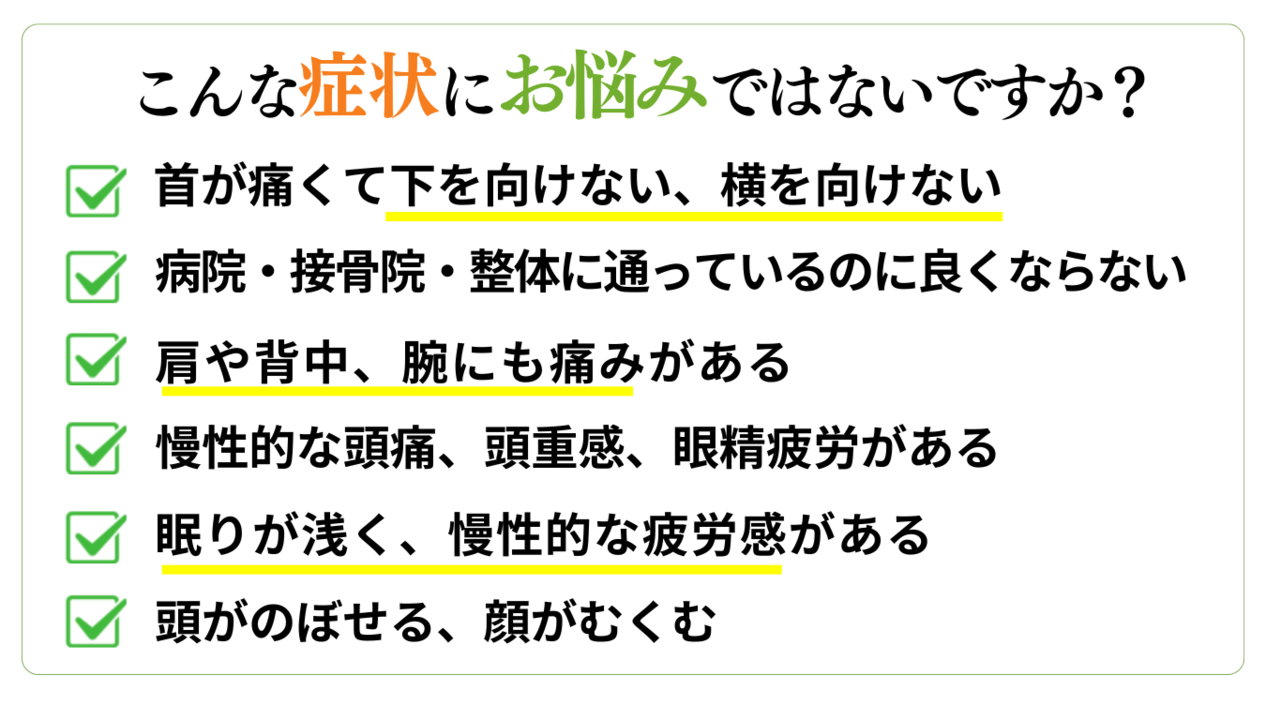 「頚椎椎間板ヘルニア」や「頚椎症」、「寝違え」「ストレートネック」など、診断名が付くものだけでなく、首周りのコリや、腕や肩の疲労からくるもの、また、眼精疲労からくるものなど、様々です。