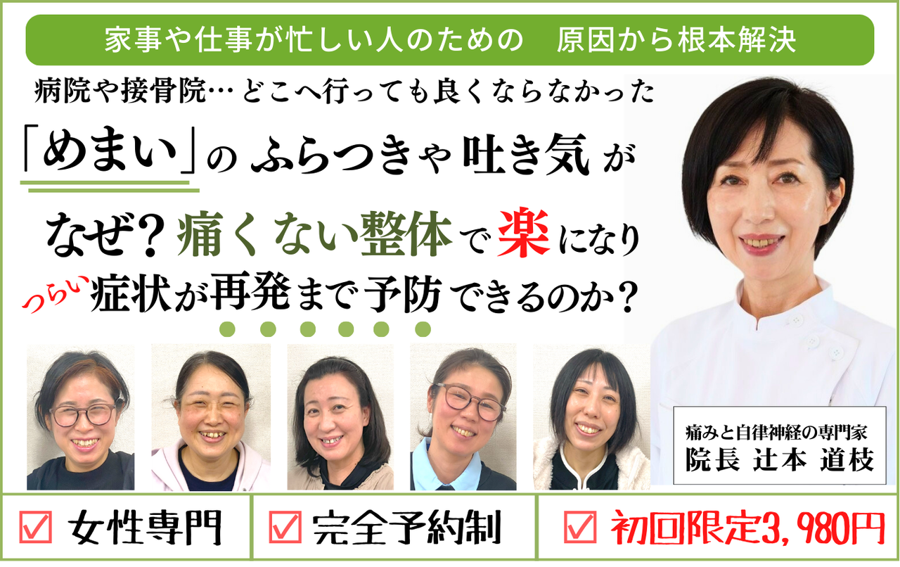 当院では全身のチェックと丁寧なカウンセリングで、あなたのめまいを改善し、痛くない・つらくないカラダを取り戻していくサポートをいたしまします。