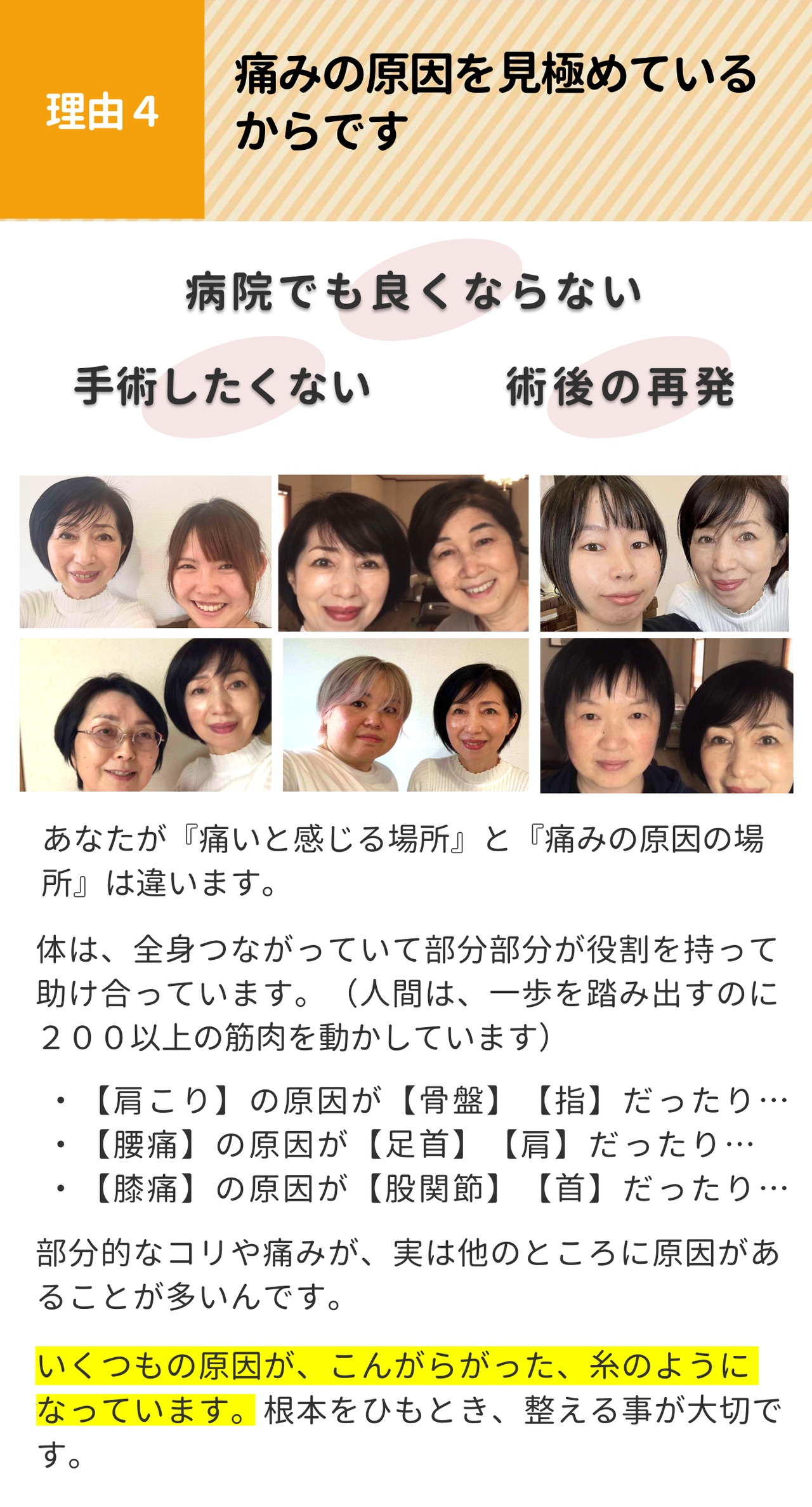 そしてどんな些細なことでも良いので、私に相談してください。きっと体の痛みや不調を根本的に解決する道筋が見つかるはずです。