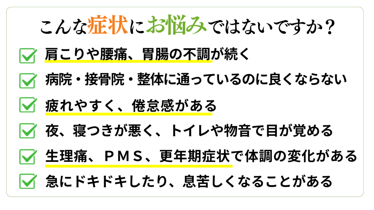 当院の、全身を整える整体で、あなたの自律神経失調症を改善し、不調に悩まされない生活を取り戻していきませんか?