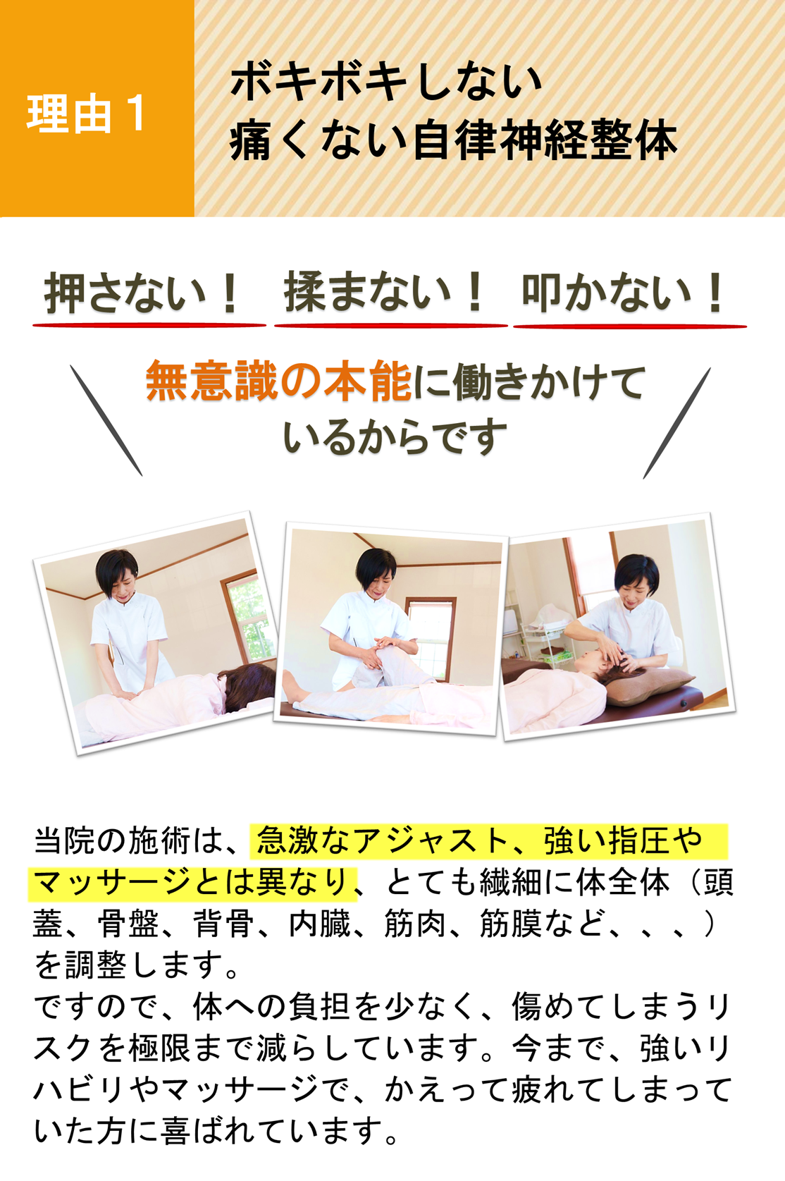 当院では全身のチェックと丁寧なカウンセリングで、あなたの自律神経失調症の根本的な原因を探し、施術します。また全身を調整し自律神経を整えていくことで、身体の免疫力が高められるので、再発予防にもなります。